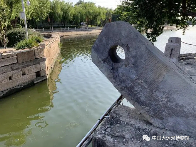 现在我们看到的文物名为绞关石,它是船闸的重要组成部分。始建于元代大德2年(1298年)的临清会通闸,保存较为完整,总长度120米以上,应是所能看到的保存最好的大型元代古闸。而会通闸上绞关石是成对出现的,其工作原理类似农村地区常见的辘轳,通过绞绳拉升,提升闸板,来蓄水泄水,放行船只,是船闸不可或缺的部件。绞关石下面是闸门的石凹糟。凹槽用来固定闸门,使闸门上升和下降都在轨道内移动。