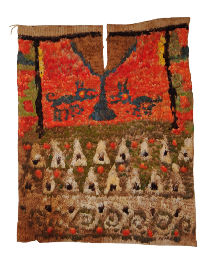 除了使用羊驼毛和棉花来纺织衣物,印加人也会使用鲜艳柔软的羽毛来制作衣物。这些羽毛来自南美洲的大型鹦鹉,尤其是亚马孙流域的金刚鹦鹉,因其尺寸大和色彩缤纷的羽毛而倍受重视。从醒目的红色、黄色、绿色、蓝色到渐变的颜色,我们可以在来自纳斯卡文化和西坎文化的服饰中感受这种雨林生物的美感和力量。
