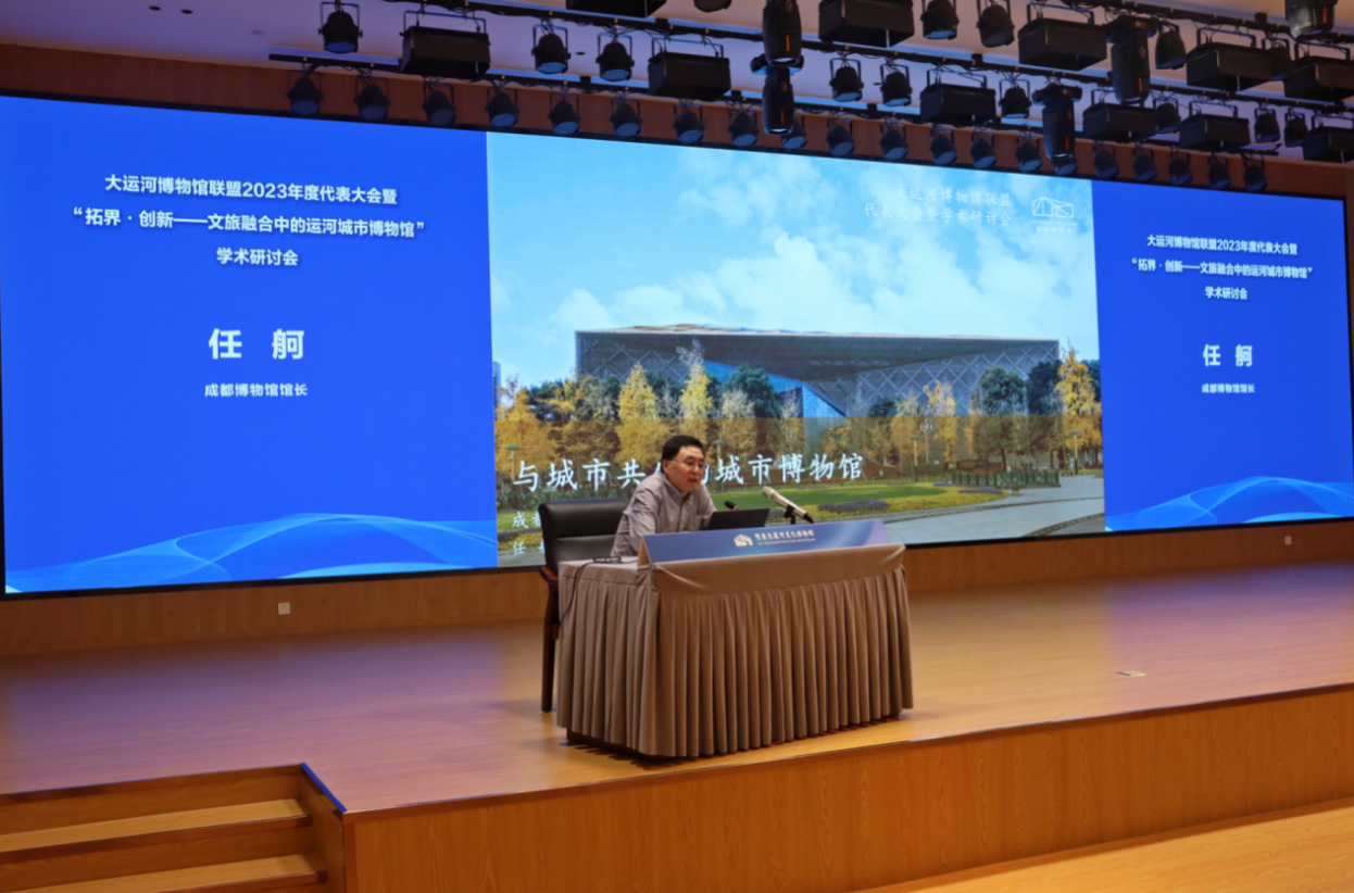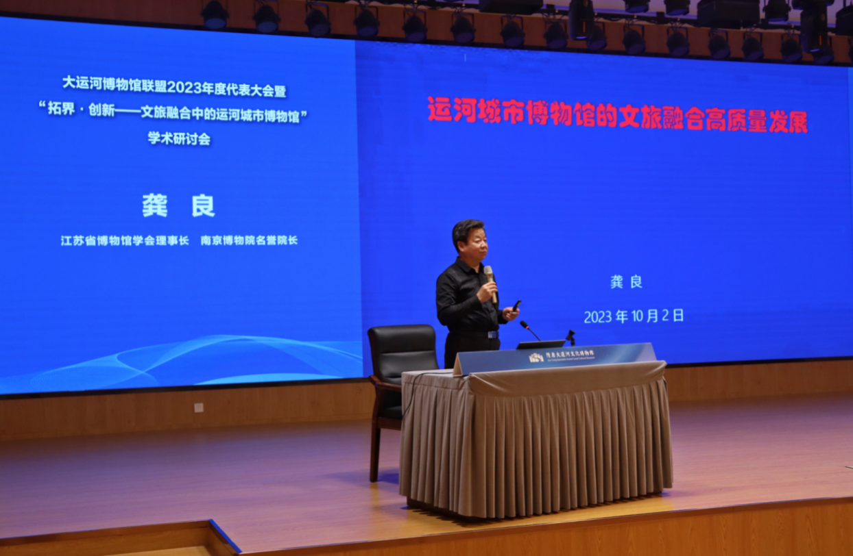 在“拓界·创新——文旅融合中的运河城市博物馆”学术研讨会上,中国博物馆协会理事长刘曙光,江苏省博物馆学会理事长、南京博物院名誉院长龚良,苏州博物馆馆长谢晓婷,成都博物馆馆长任舸,浙江省博物馆副馆长蔡琴,复旦大学文物与博物馆学系教授魏峻,洛阳隋唐大运河文化博物馆馆长曹岳森,北京艺术博物馆馆长陈静等10位专家进行了主旨发言。